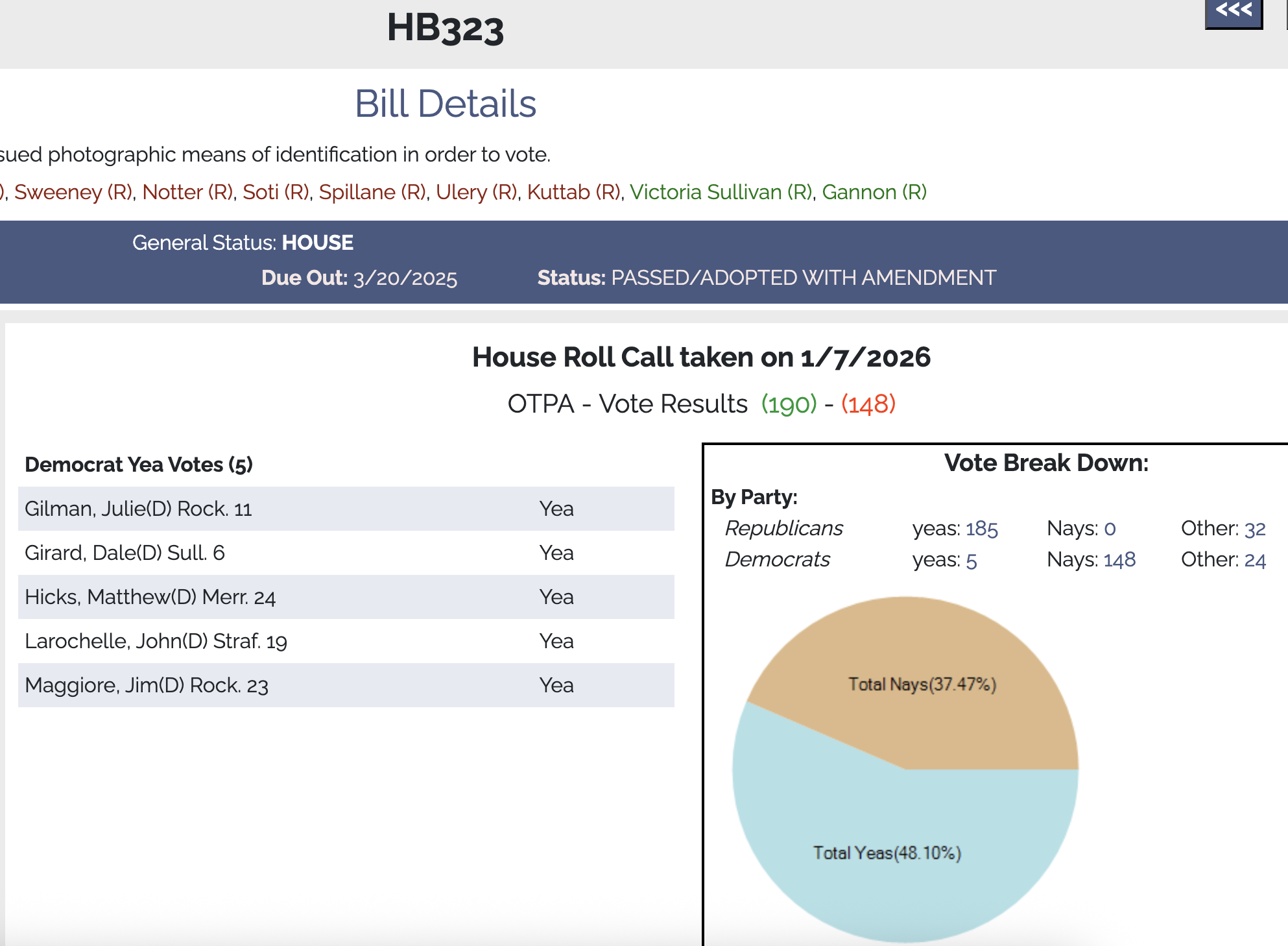 HB 323, which would ban student IDs from being used to check in and vote at the polls, passed the House on January 7. The bill is based on false claims of voter fraud and would make voting harder for many eligible Granite Staters, especially young people. While the vast majority of Democrats opposed the bill, five Democratic representatives crossed party lines to vote in favor of HB 323: